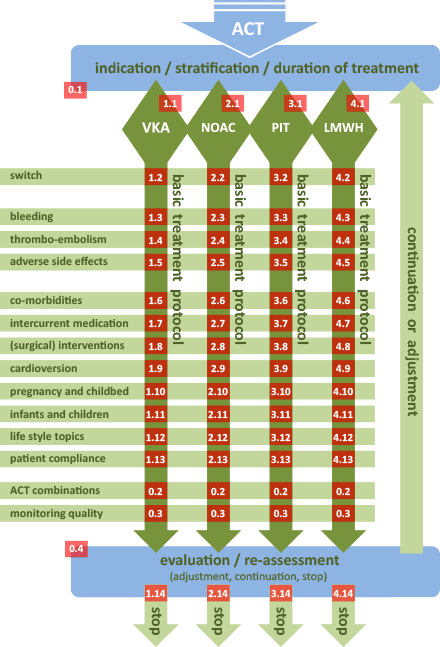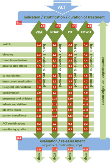 In de regiotafel werd vastgesteld dat een regionaal transmuraal protocol antistolling breed moet gelden, een implementatietool voor de reeds bestaande richtlijnen dient te zijn en dat de LSKA 2.0 hierin moet worden meegenomen. Het moet vooral praktisch zijn om gebruik te stimuleren. Hiervoor is een ‘organizer’ ontwikkeld (Figuur 1) met verticaal verschillende activiteiten en horizontaal de vier grote groepen antistollingsmedicaties. Op elk vakje kan geklikt worden en dan komt de gebruiker bij het relevante deelprotocol. Deze is web-based waardoor beheer en aanpassing onafhankelijk zijn van heersende ICT-systemen bij ketenpartners.