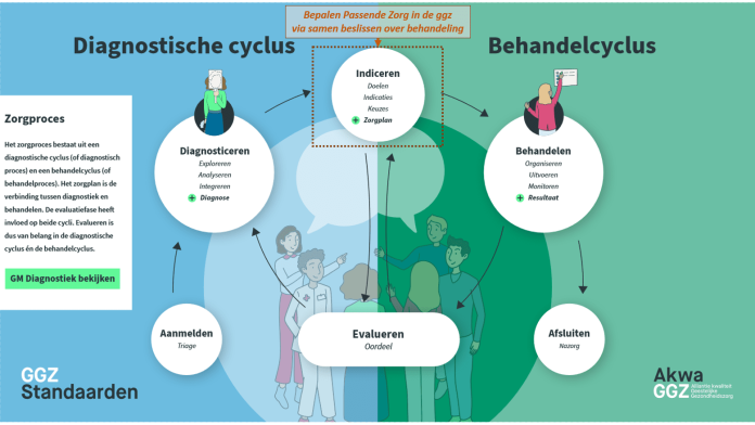 Het concept passende zorg is sinds kort leidend bij kwaliteitsverbetering in de zorg. De ggz is al sinds 2014 bezig met de bevordering van passende zorg, onder andere via het opstellen van kwaliteitsstandaarden. Samen beslissen, een van de vier principes van passende zorg, is een belangrijk thema in deze kwaliteitsstandaarden. In de recent verschenen Generieke Module Diagnostiek is een belangrijke stap gezet door samen beslissen expliciet vast te leggen als onderdeel van het zorgproces (zie figuur 1).