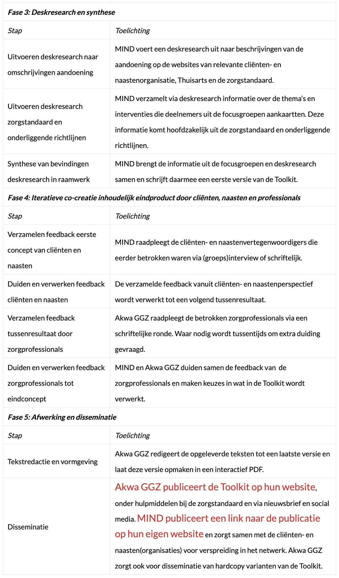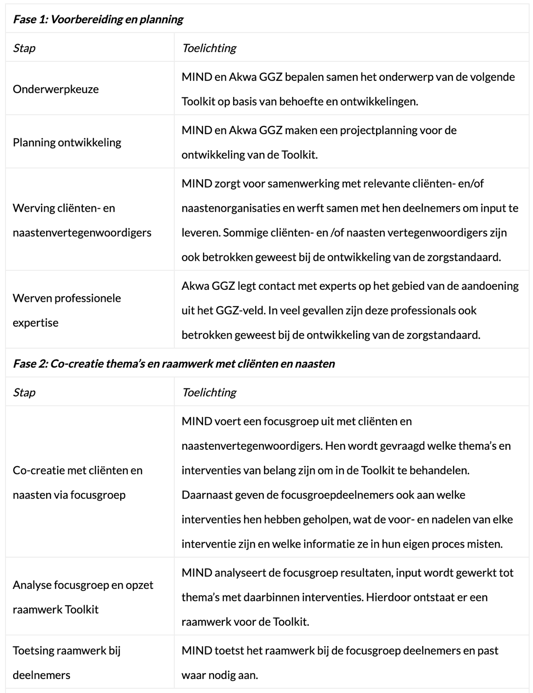 Gedurende het hele ontwikkelproces staat het cliĆ«nten- en naastenperspectief centraal. CliĆ«nten en naasten worden van begin af aan betrokken. Ook bepalen zij welke themaās aan bod komen in de toolkits en dragen zij interventies aan waar zij cliĆ«nten en naasten op willen wijzen. Vervolgens biedt de zorgstandaard van Akwa GGZ, inclusief onderliggende richtlijnen en andere documenten, het kader voor het al dan niet includeren van verschillende mogelijkheden voor behandeling en begeleiding. In sommige gevallen worden interventies beschreven die niet expliciet in de zorgstandaard staan vermeld, maar in de praktijk worden ingezet. Het al dan niet opnemen van deze interventies worden door Akwa GGZ en MIND samen besproken. Daarbij weegt het belang van opname vanuit het perspectief van cliĆ«nten en naasten zwaar in de besluitvorming. Eventuele controversiĆ«le afwijkingen ten opzichte van de zorgstandaard worden in de Toolkit gemarkeerd en kort geduid. Het ontwikkelproces van de Toolkits Samen Beslissen staat beschreven in tabel 1.