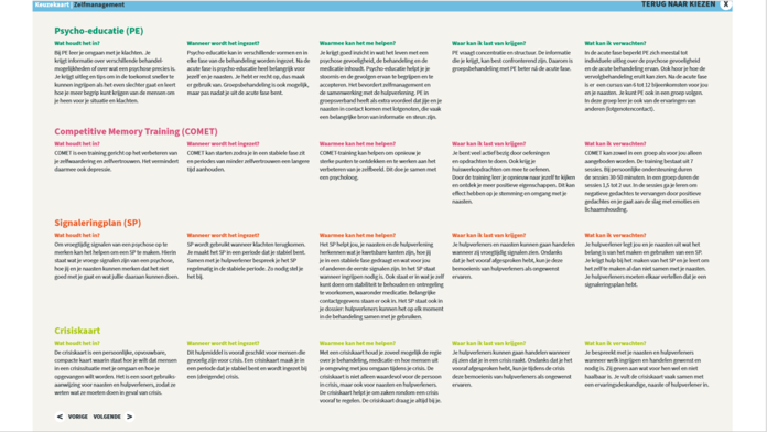 3. Keuzekaarten: dit zijn overzichten met interventies die per thema op ƩƩn kaart zijn gevat. Aan de hand van vijf dezelfde vragen wordt er informatie gegeven over de interventie (tabel kolom), en er staan meerdere interventies naast elkaar (tabelrijen). De vijf vragen zijn een uitwerking van de eerste twee van de drie goede vragen van Patientenfederatie Nederland. De informatie wordt gelaagd aangeboden: per keuzekaart is er een overzichtspagina die de opties naast elkaar zet in samenvatting, gevolgd door een detailpagina waarop de vraagelementen staan uitgeschreven.