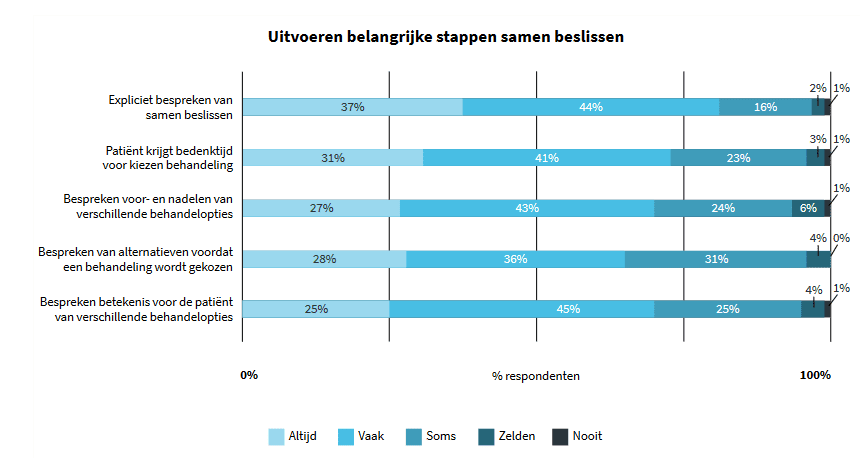 Er zijn peilingen gedaan naar in hoeverre het thema samen beslissen in de praktijk zijn weerslag krijgt. Belangenbehartiger MIND deed dit onder cliënten en naasten, terwijl kwaliteitszorgorganisatie Akwa GGZ de praktijkervaringen van zorgprofessionals peilde. In de Akwa GGZ peiling (2021; zie figuur 2)  is te zien dat professionals ervaren dat zij de belangrijkste stappen van samen beslissen op zijn minst soms uitvoeren. Van alle stappen wordt het expliciet bespreken van samen beslissen met 81 procent het vaakst uitgevoerd. Het bespreken van alternatieve behandelopties wordt volgens 65% van de professionals vaak of altijd gedaan.