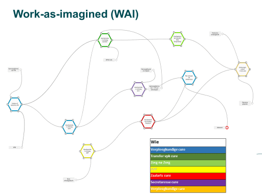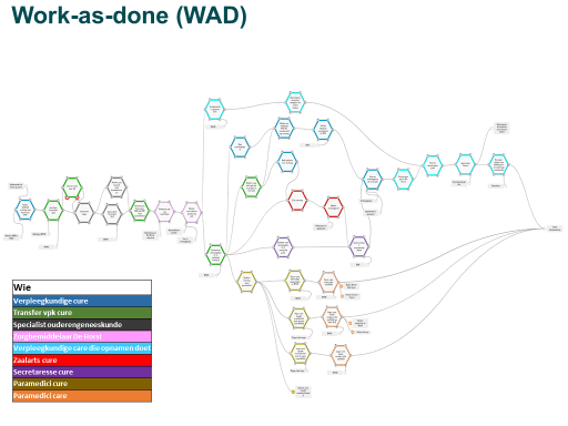 Als FRAM-team, bestaande uit vier medewerkers van de afdeling Kwaliteit & Veiligheid, zijn we als eerste aan de slag gegaan om het proces zoals het beschreven is in de aanwezige protocollen schematisch weer te geven in een FRAM-model, de zogenaamde Work-As-Imagined (WAI). De WAI maakt zichtbaar hoe op grond van de documentatie het werk in de praktijk geacht wordt te verlopen. Dit model ziet er redelijk beknopt en overzichtelijk uit.