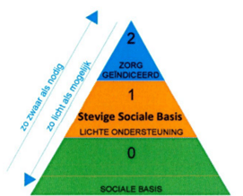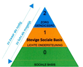 Onderstaand plaatje van de gemeente Haarlemmermeer visualiseert het zorg- en welzijnsveld als een piramidestructuur.[2] Actieve burgers en eerstelijns-professionals vormen een brede sociale basis, de zwaardere specialistische zorg vormt de top (zie figuur 2). De opgave is zoveel mogelijk binnen de onderkant van de piramide op te lossen.